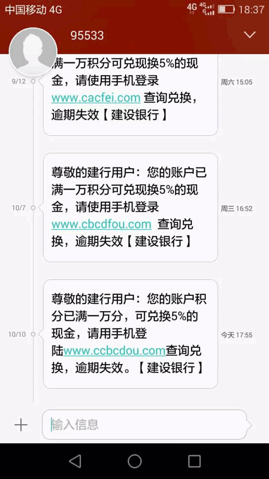 這些信息的內(nèi)容基本是“積分兌換”的消息,而發(fā)出信息的電話則顯示為銀行的客服號(hào)碼。