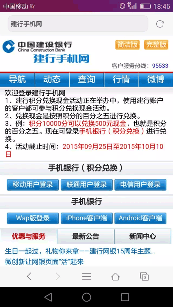 一萬(wàn)積分兌換500元,簡(jiǎn)直是天上掉現(xiàn)金的感覺(jué),于是便有市民心動(dòng)了,點(diǎn)擊了短信中的鏈接。這時(shí),手機(jī)跳轉(zhuǎn)到了一個(gè)上網(wǎng)界面,顯示是“建行手機(jī)網(wǎng)”。